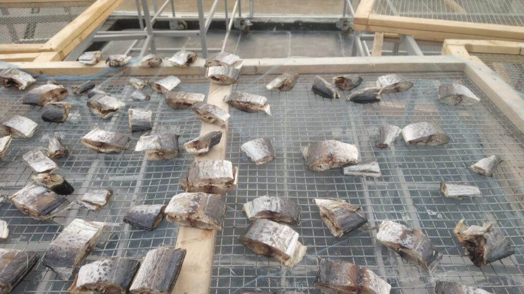 Fermented and sun-dried fish are light brown in colour with a dry, firm texture. Products made from partially spoiled fish have a characteristic strong smell. A well-dried product can be stored for at least three months.